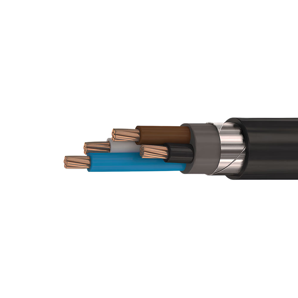 1. Четыре однопроволочные или многопроволочные круглые уплотнённые или секторные токопроводящие медные жилы номинальным сечением 50 мм2, соответствующие 1 или 2 классу по ГОСТ 22483-2021. 2. Изоляция жилы из ПВХ пластиката пониженной пожароопасности номинальной толщиной 1,4 мм. 3. Заполнение внутренних и наружных промежутков между скрученными изолированными жилами многожильных кабелей. 4. Поясная изоляция из ПВХ пластиката пониженной пожароопасности номинальной толщиной 1,2 мм. 5. Броня из двух стальных оцинкованных лент толщиной не менее 0,2 мм. 6. Герметичный защитный шланг из ПВХ пластиката пониженной пожароопасности номинальной толщиной 2,0 мм.